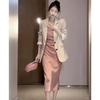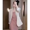 Ridicați-vă garderoba de toamnă cu acest set sofisticat din două piese, cu o jachetă de costum croită și o rochie elegantă tip slip.. Setul este împodobit cu aplicații unice și decorațiuni matlasate, adăugând o notă de textură și eleganță.. Realizat din PVC durabil, asigură atât confort, cât și un aspect chic, făcându-l perfect pentru întâlniri sociale sau o seară în oraș.. Acest ansamblu combină fără efort funcționalitatea și moda, făcându-l indispensabil pentru fashionista modernă.