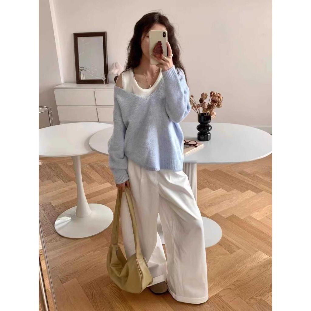 2024 Women's Elegant V-Neck Pullover Sweater & Korean-Style Vest Two-Piece Set for Autumn/Winter