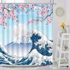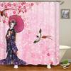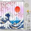 Japanese Shower Curtain, Sea Waves Cherry Blossom Red Sun Anime Kimono Woman Mount Fuji Landscape Ink Crane Bird Bathroom Decor