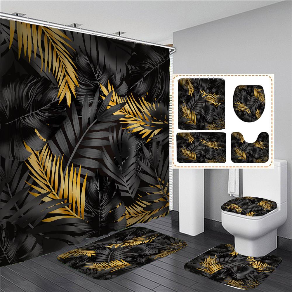 Black and Gold Tropical Plant Palm Leaf Bathroom Shower Curtain Set for Bathtub Exotic Leaves Bath Mats Rugs Toilet Home Decor