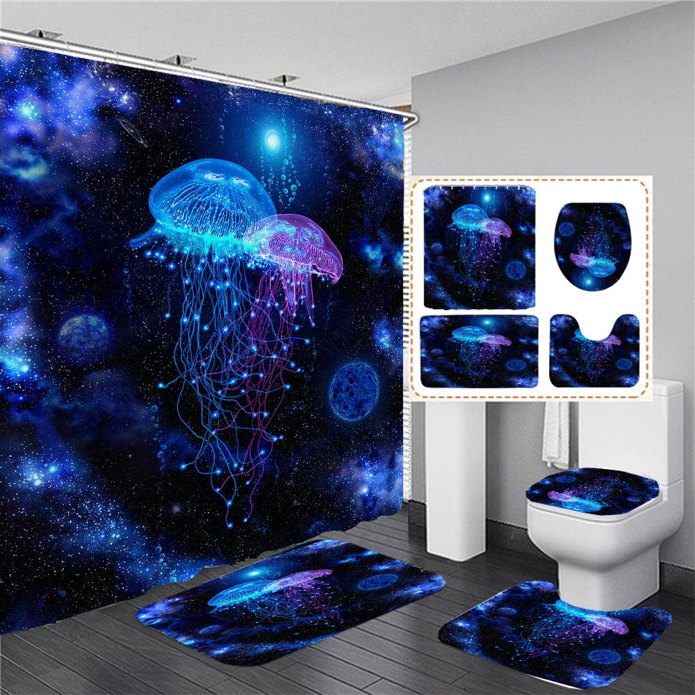 Dream Starry Sky Ocean Jellyfish Bathroom Waterproof Shower Curtain Set with 12 Hooks Bath Non-Slip Mat Rugs Toilet Seat Cover