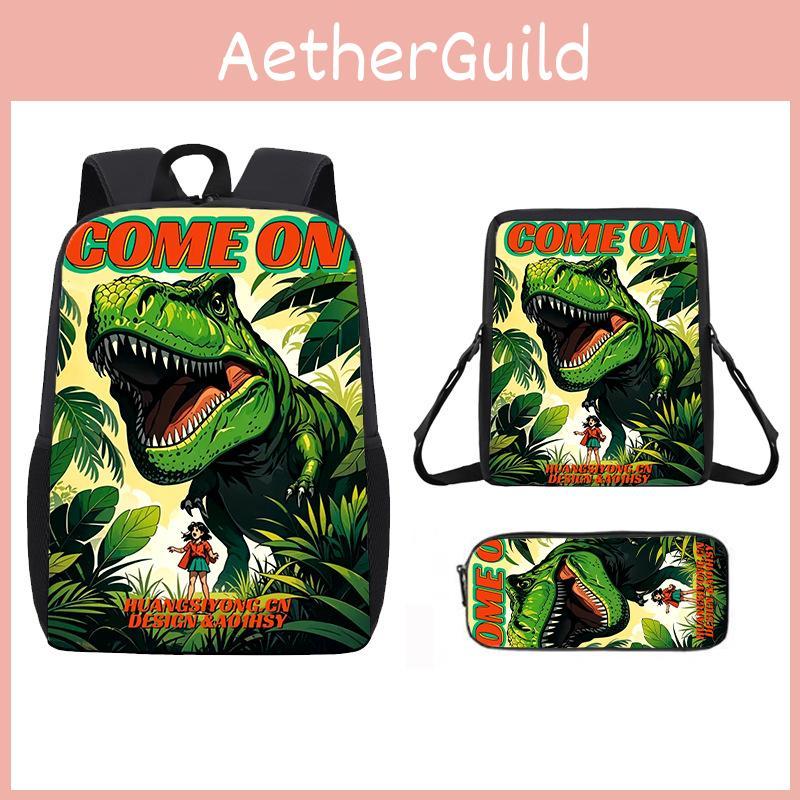 This children's backpack features a lightweight design with breathable oxford cloth material, measuring 17 inches in size. It supports daily school use with a padded air cushion strap system for comfortable carrying. The set includes a backpack, shoulder bag, and pencil case, all with playful dinosaur prints. Easy to clean with a damp cloth.