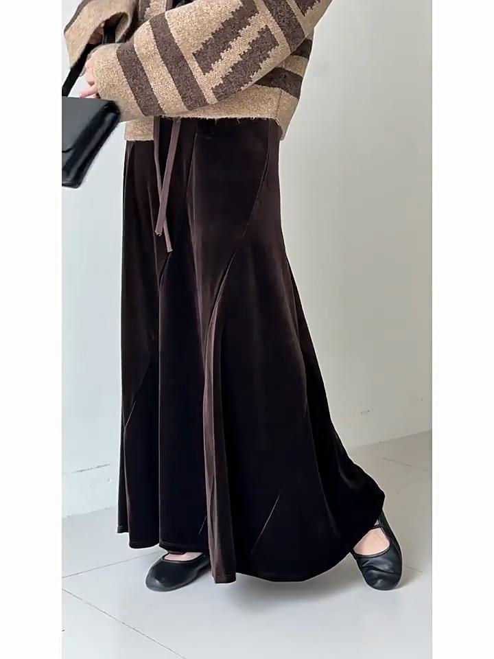 Johnature Fustă plisată de catifea în stil coreean pentru femei, toamnă, casual, universală, largă, cu talie înaltă, fuste lungi