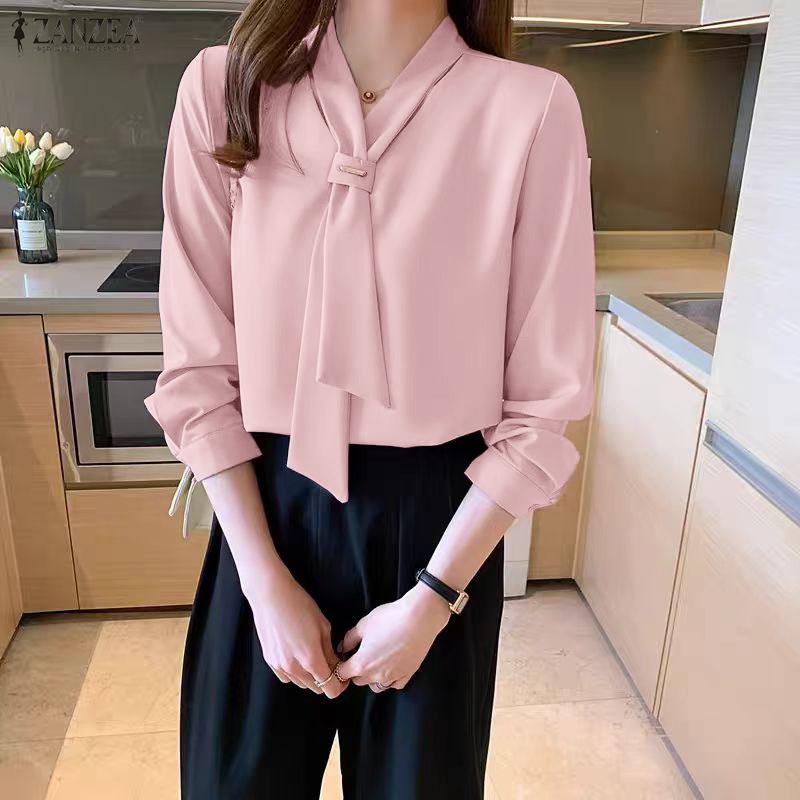 ZANZEA Women Casual Bow Collar Solid Color 3/4 Sleeve Blouse