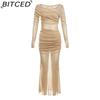 BITCED Fall Women's Solid-Color Slim-Fit High-Waisted Fashion O-Neck Long-Sleeve Mesh Dress
