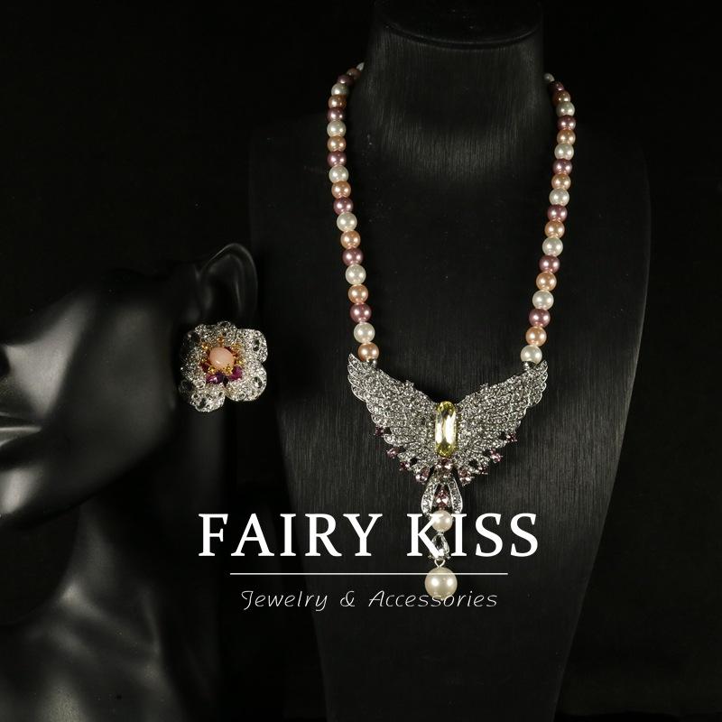 Earring Set Colored Imitation Pearl Chain Densely Studded with Diamond Wings Necklace Brooch Dual-purpose Exquisite Flower Earrings