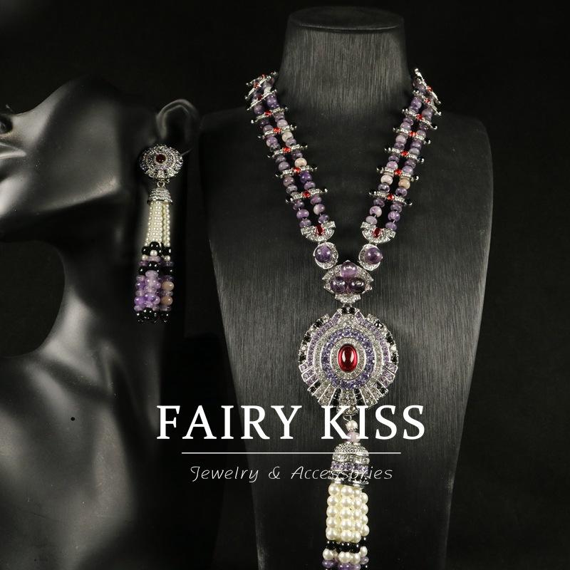 Sweeping Shoulder Purple Fringed Beaded Color Matching Earrings Necklace Set Versatile Classic Retro Accessories
