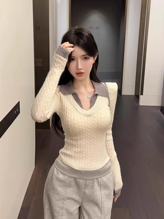 Hong Kong Style Women's V-Neck Polo Collar Knit Sweater - Autumn/Winter Fashion Trend
