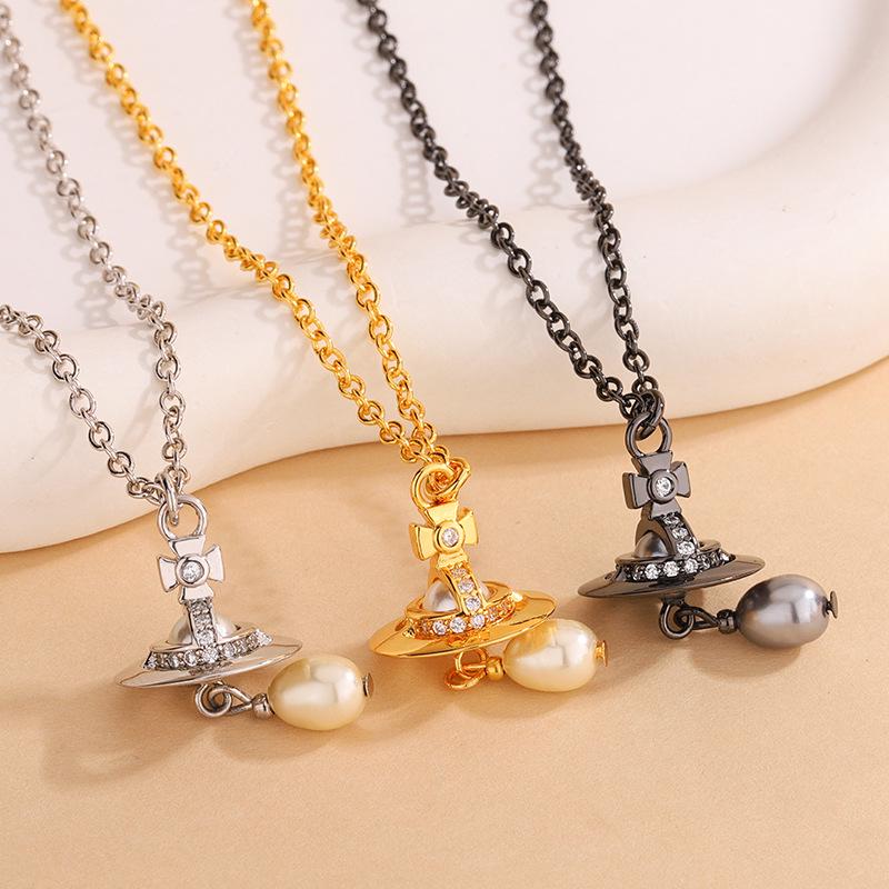 Empress Dowager 3D Saturn Baroque Pearl Teardrop Pendant Necklace - European & American Punk Clavicle Chain.
