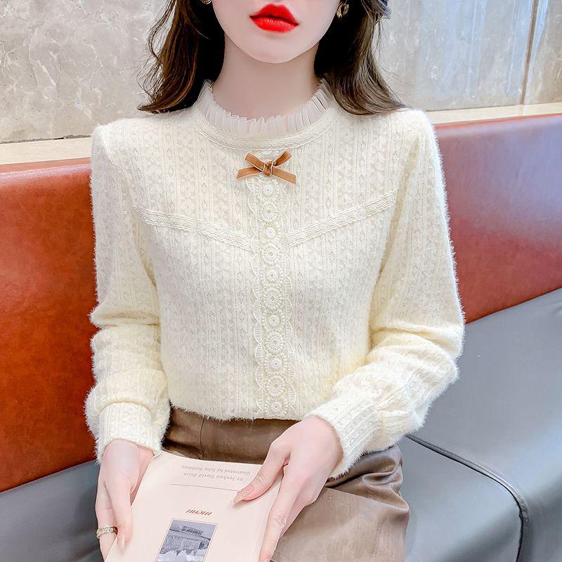 2025 Autumn/Winter Korean Bow Slimming Lace Shirt - Fleece-Lined, Long Sleeve, Versatile Women's Style