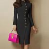 Eleganta la moda pentru femei Rochie uni cu maneci lungi, guler stand-up, croiala cambrata, nasturi metalici, fenta