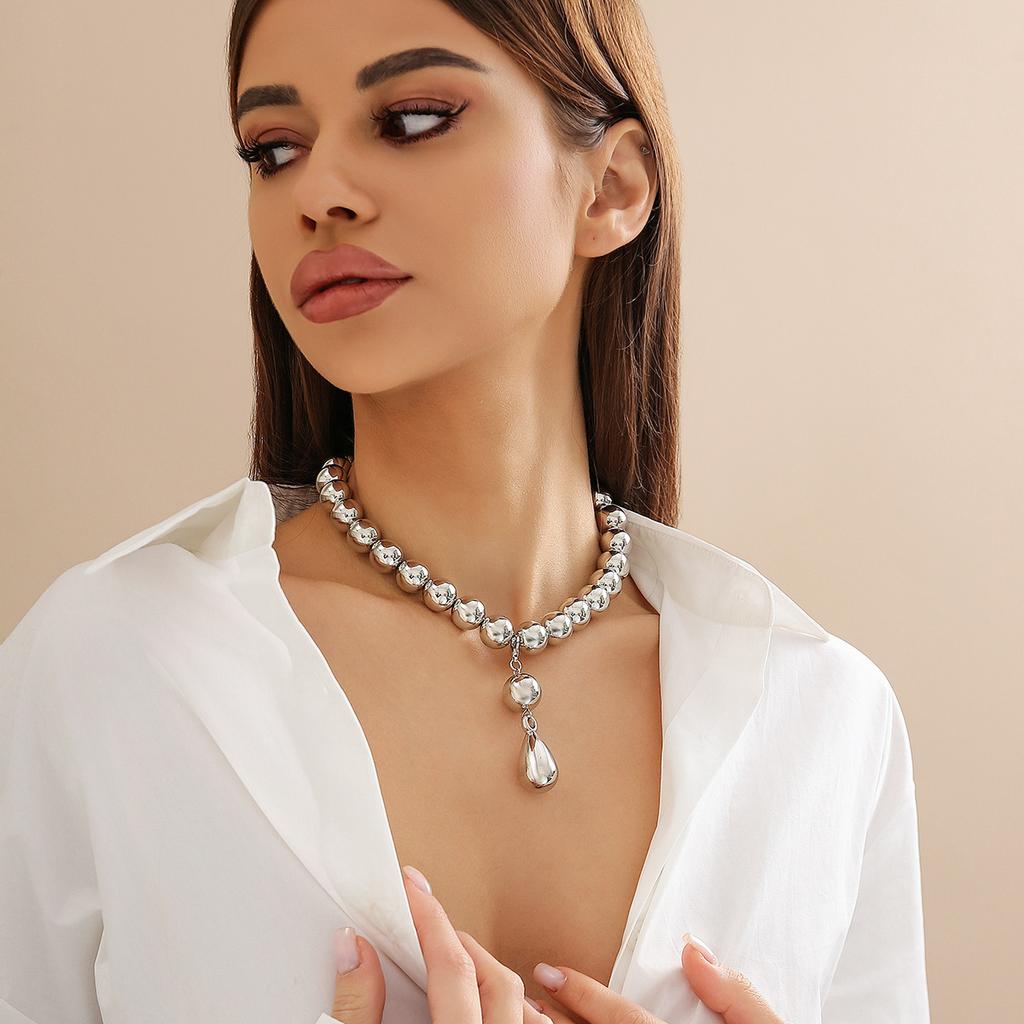 Tone Zinc Alloy Bead Choker Necklace For Women, Statement Teardrop Pendant Chain Necklace, Chunky Metallic Jewelry For Daily Wear & Gifting