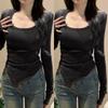 Korean Style Asymmetric Slit Long Sleeve U-Neck Slimming Women's Top - Spring/Summer Fashion