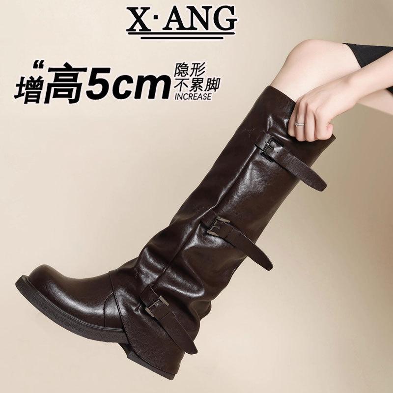 Leather Tall Boots Women's Boots But Knee Boots Thick Heel Thick Sole Height Increasing Knight Boots Western Cowboy Boots Pile Boots