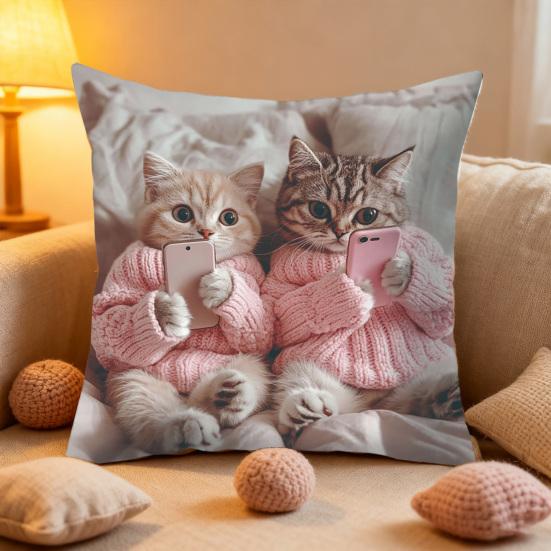 Model drăguț de pisică 2D imprimat plat pentru vibrații festive: Îmbrățișează spiritul sărbătorilor cu adorabilul model de pisică de pe această față de pernă. Culorile vii și designul inteligent completează fără efort atmosfera de Crăciun, făcându-l o adiție perfectă pentru decorațiunile de sărbători sau scenele confortabile de zi cu zi.