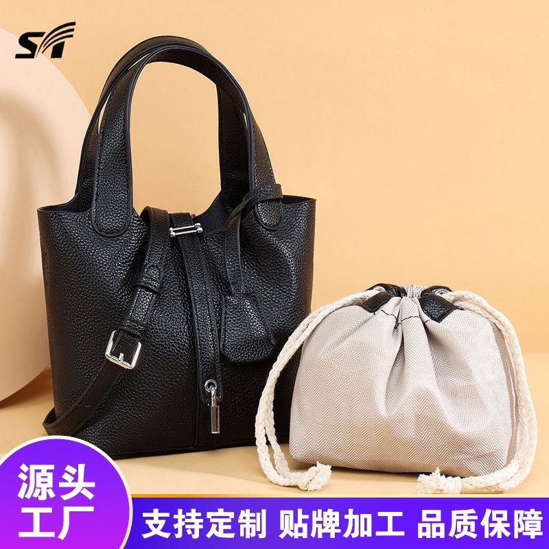 The top layer of cowhide women's bag, high-end leather bucket bag, handbag bag, commuter lychee pattern one-shoulder crossbody mom bag