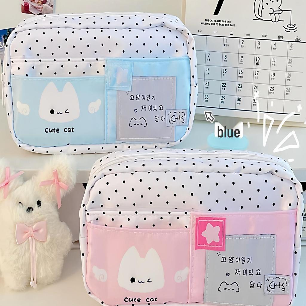Tongxin Multi-Layer Blue Polka Dot Kitten Ita Bag Pencil Case - Versatile, Large-Capacity Stationery Holder
