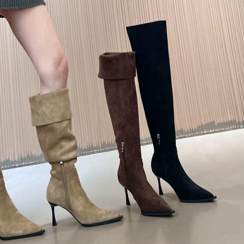 Suede Stiletto High Boots Fashion Pointed Toe Side Zipper Soft Sole Non-Slip Wear-Resistant High Heels