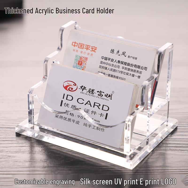 Suport transparent din acril pentru cărți de vizită, design minimalist cu mai multe compartimente și capacitate mare pentru depozitare pe birou.