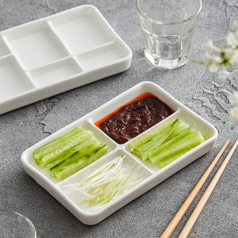 White rectangular multi-compartment ceramic seasoning compartments plate, dipping sauce, side dishes, barbecue sauce dish