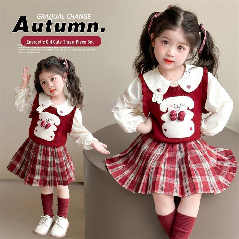 This charming girls' outfit set is perfect for adding a whimsical touch to autumn wardrobes. Featuring a delightful cartoon sweater vest with long sleeves and crafted from a cozy cotton blend, it promises both comfort and style. Paired with a chic JK plaid skirt, this ensemble offers a playful yet fashionable look for any occasion. Ideal for cooler days, this set is a lovely choice for the young trendsetter.