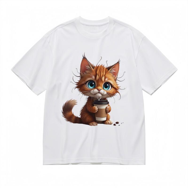 Women's All-Season Classic T-Shirt Playful Feline with Steaming Cup Graphic Tee