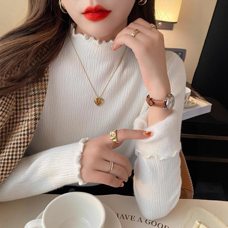 Semi-turtleneck bottoming shirt women's autumn and winter fleece thickened integrated fleece sweater lace fungus edge with knitted sweater top