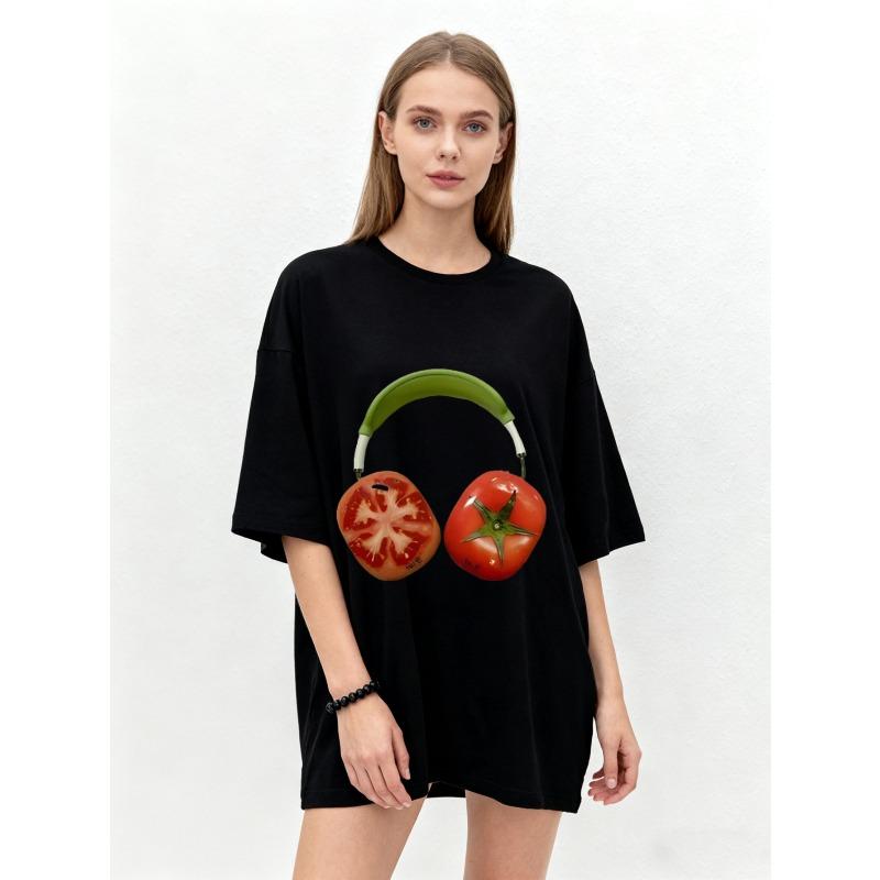Oversized T Shirt Black Tomato Headphones Print Casual Wear for Women Summer Streetwear Fashion Trendy Graphic Tee