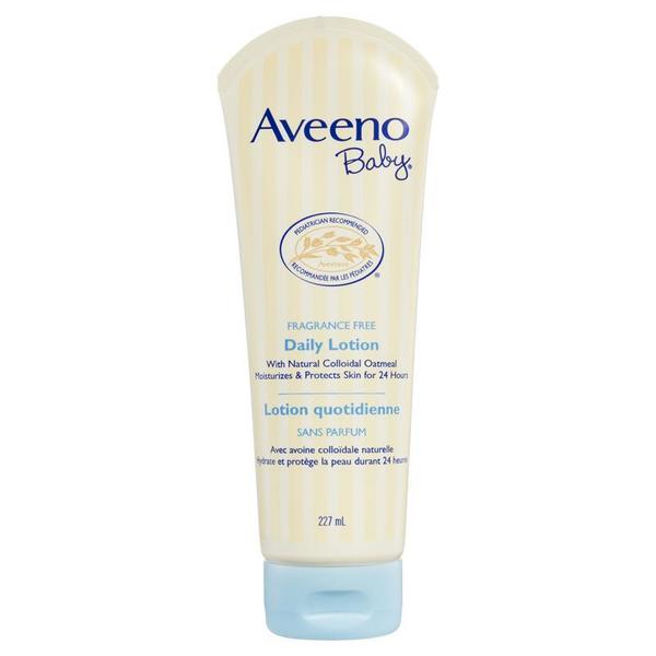 Loțiunea zilnică Aveeno Baby cu ovăz coloidal natural hidratează și protejează pielea timp de 24 de ore.