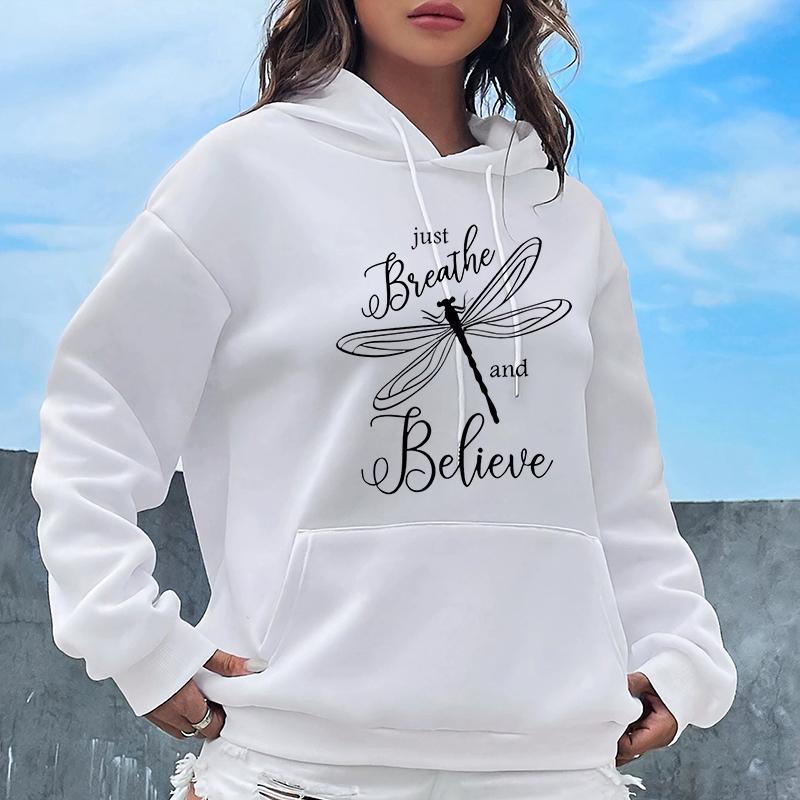 Women's Casual Dragonfly Sweatshirts Gothic Y2k Hoody Pullovers Just Breathe Believe Design Graphic Hoodies Streetwear Clothes