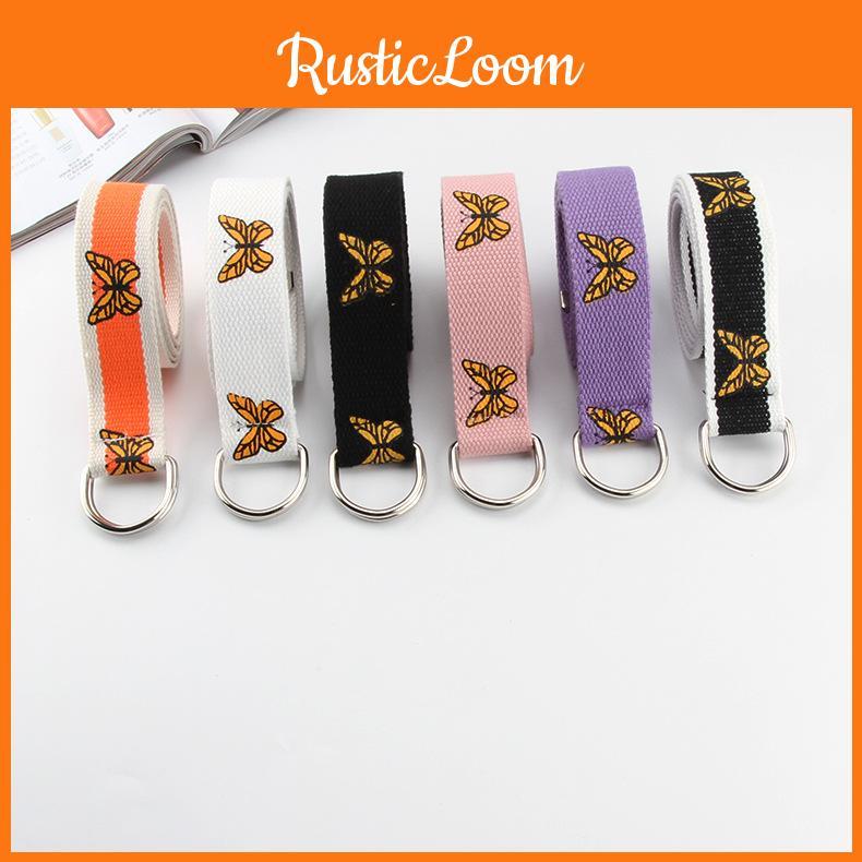 Belt Waist Canvas For Adults With Butterfly Print Double Ring Casual Buckle