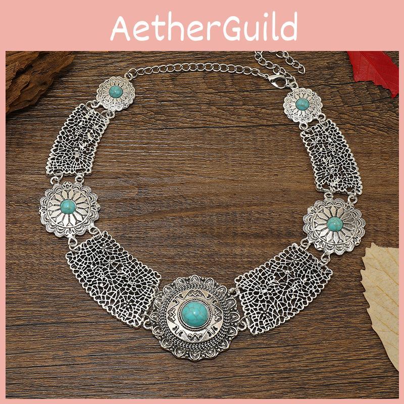 Ethnic Style Simulation Gemstone Decoration Hollow Design Women Metal Necklace