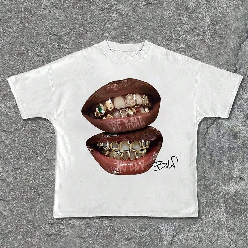 Chic Lips Golden Teeth Vintage T-shirt Rock Goth Casual Tee Clothing Men Oversized Cotton T Shirt Harajuku Y2k Tops Streetwear