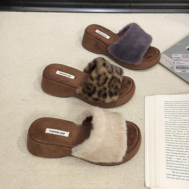 Retro leopard print square head fluffy slippers women wear autumn and winter new temperament fluffy lazy one-word cotton mop