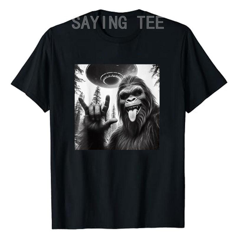 Funny Sasquatch Bigfoot Rock on Selfie with UFO Alien T-Shirt Humorous Father's Day Daddy Gift Short Sleeve Awesome Saying Tee