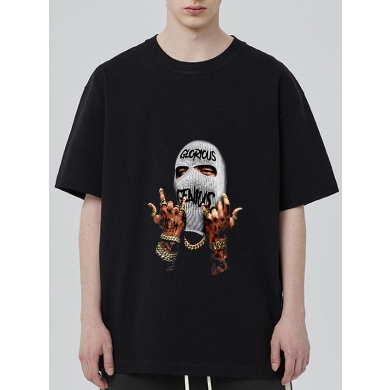 Black T Shirt with Glorious Genius Balaclava and Tattooed Hands Print Streetwear Fashion Casual Wear