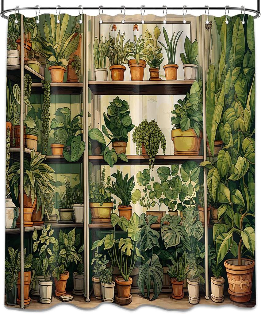 Botanical Shower Curtain, Vintage Green Plant Print, Fake Potted Florals, Waterproof Fabric Bathroom Set