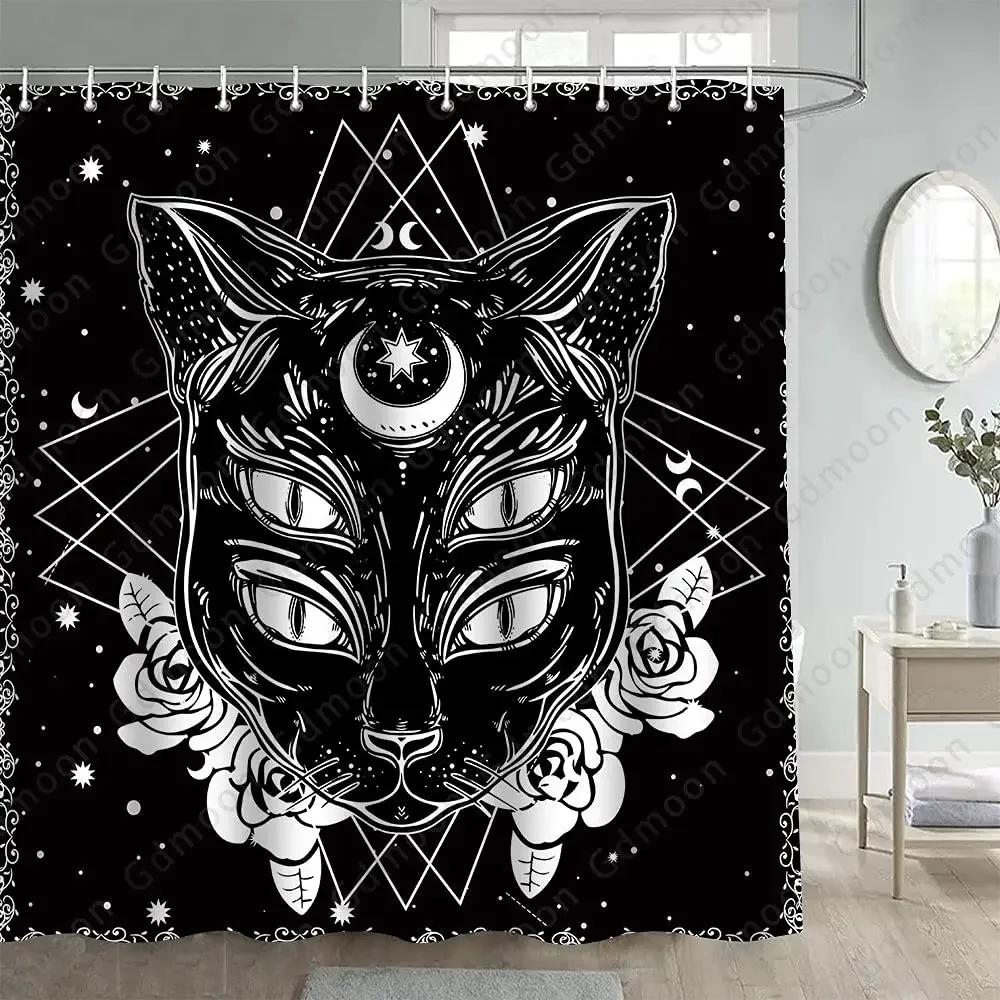Egyptian Cat Shower Curtain Ancient Black Cat Animal Mystic Wizard Divination Astrolabe Moon Starry Sky Tarot Bathroom Curtain