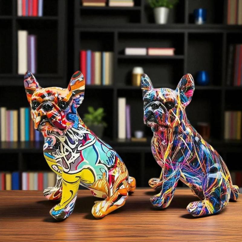 Statuie Rășină Bulldog Francez Colorat Stil Graffiti Figurină Câine pentru Raft Desktop sau Decor Cameră Ornament îndrăzneț pentru Iubitor de Animale de Companie Cadou