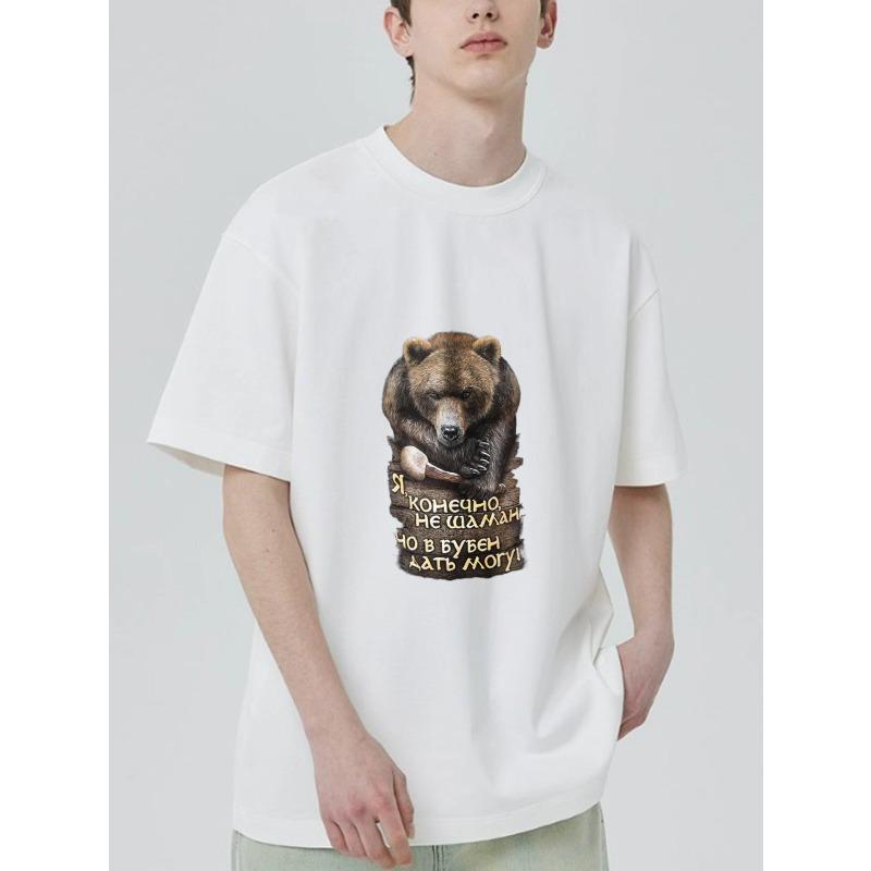 Black T Shirt with Bear and Russian Text Print for Casual Wear
