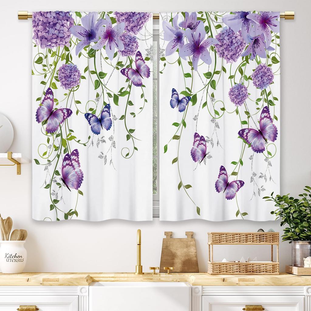 Purple Floral Butterfly Kitchen Curtains Rustic Flower Small Short Cafe Window Curtains Farmhouse Botanical Window Drape