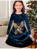 Girls' Autumn and Winter Fashion Dress, 3D Kitten Print Round Neck Long Children's T-shirt Dress, Casual Versatile, Christmas Clothing