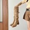 Cowhide version but knee boots women's autumn thin retro western thick heel knight boots medium tube stacking boots