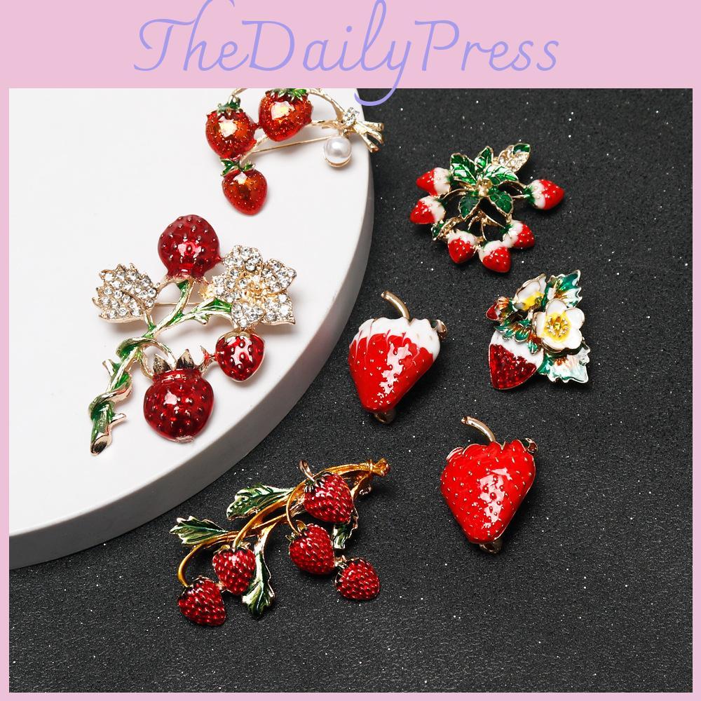 This decorative brooch features a strawberry-inspired design crafted from durable alloy with a sleek electroplated finish. it combines fruit and floral motifs for a charming, versatile accessory suitable for daily wear or special occasions. Ideal for adding a touch of elegance to casual or business outfits, it supports easy pinning and remains resistant to tarnishing. Wipe clean with a soft cloth to maintain its shine.