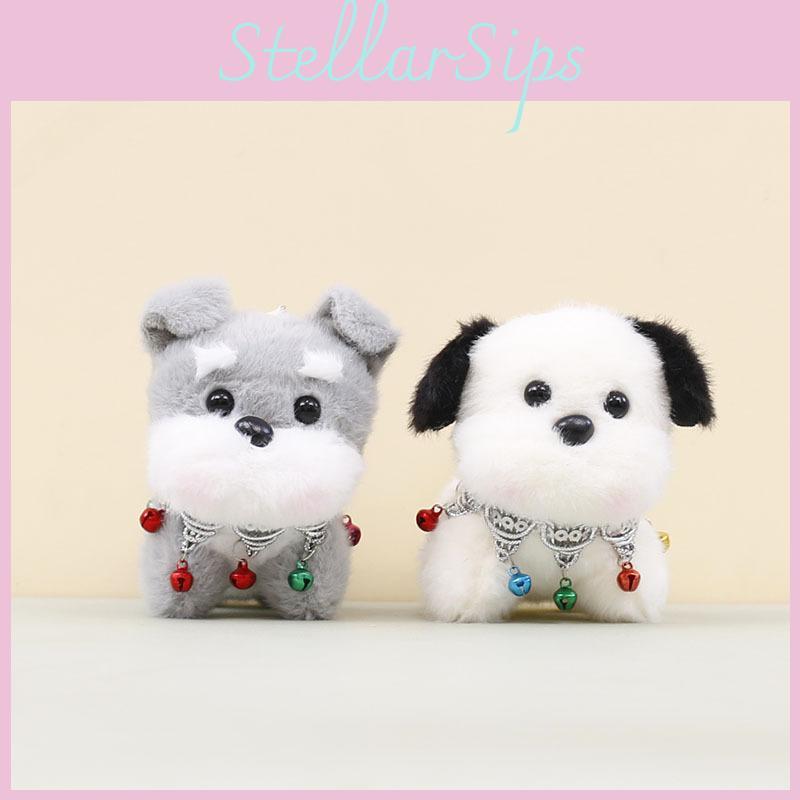 This soft plush dog charm features a compact 12cm design crafted from durable PP cotton with short plush fabric, providing a gentle texture. It includes a built-in bell that produces a clear sound, making it ideal for bag decorations or small toy collections. Easy to clean with a damp cloth, it adds playful charm to daily accessories and collectibles.