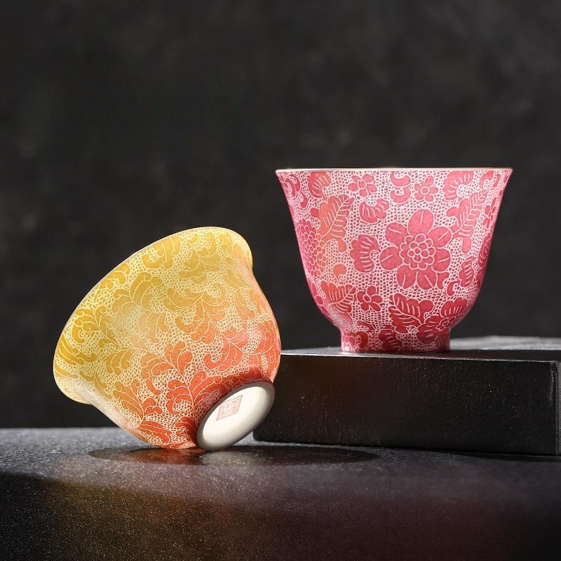Handmade Ceramic Teacup Double Color Carved Floral Chinese Gongfu Tea Set Personal Master Cup for Tea Ceremony Festival Gift