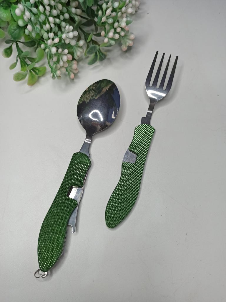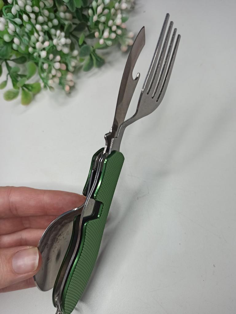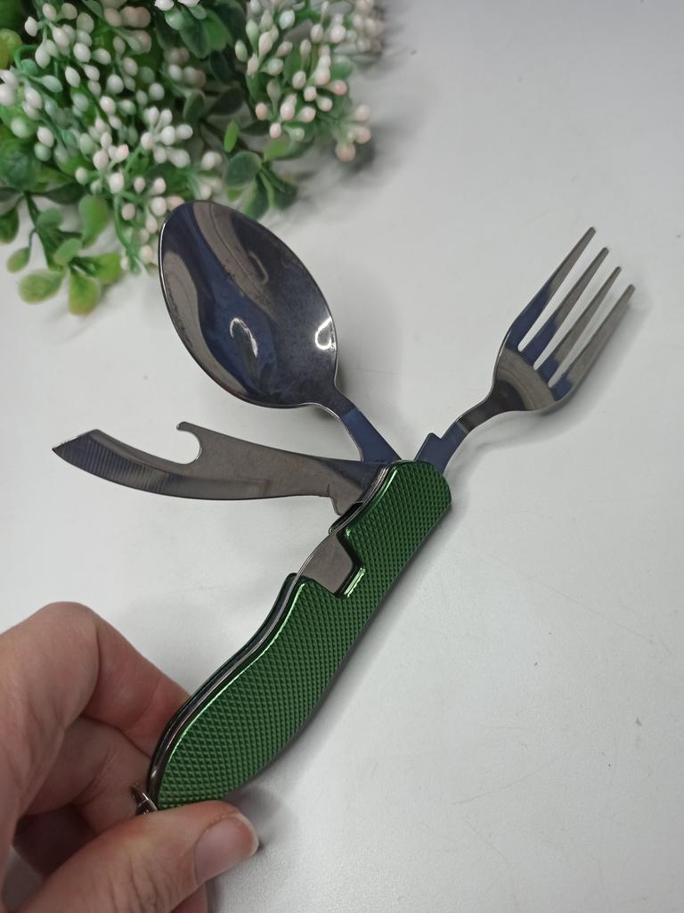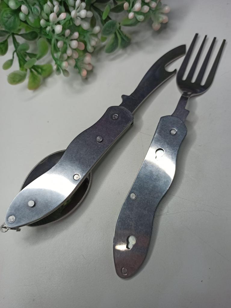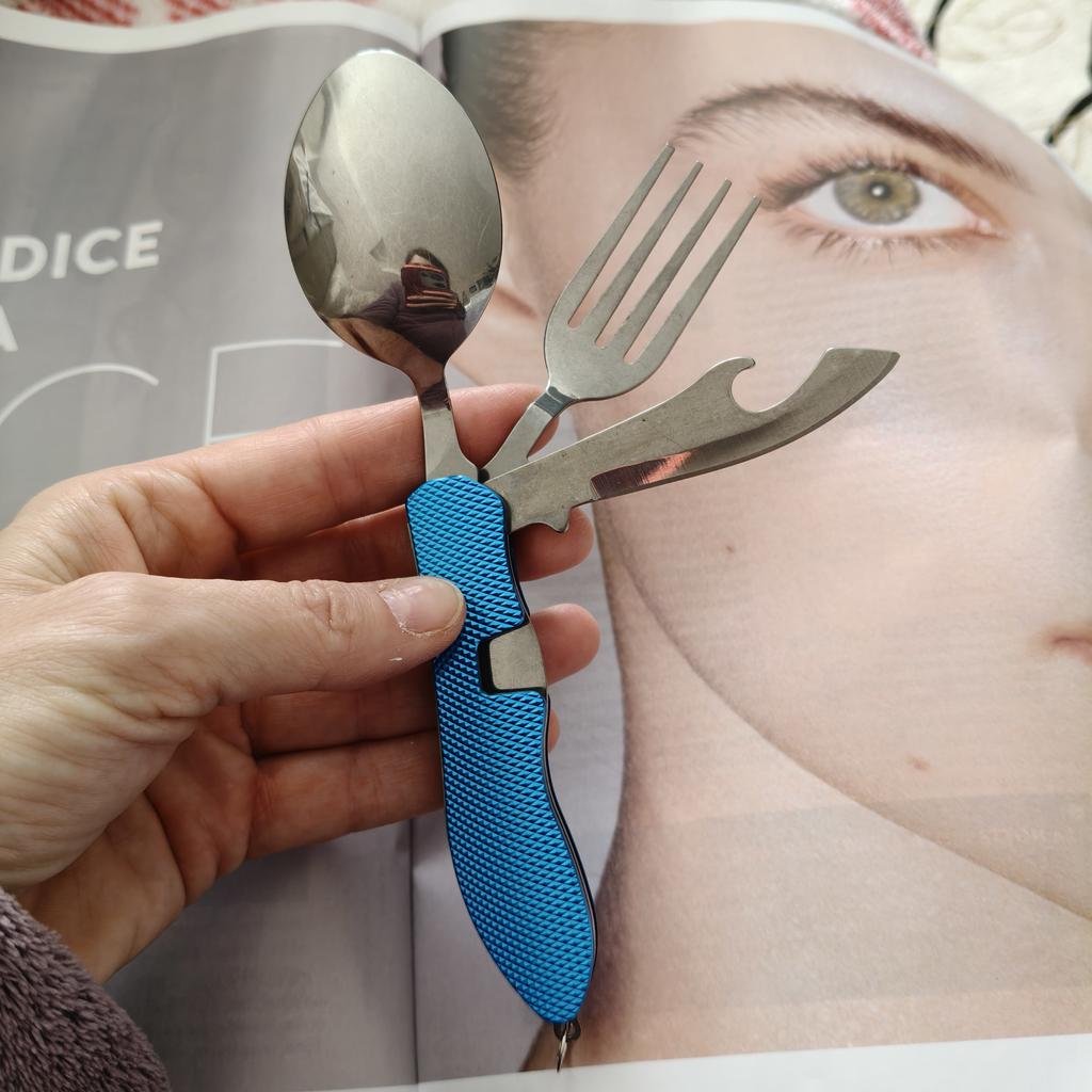 Set turistic de tacâmuri 4 în 1 Include: furculiță, lingură, cuțit și deschizător de sticle. Set multifuncțional, indispensabil într-o multitudine de situații, fie că este vorba de o drumeție, pescuit, vânătoare sau chiar doar un picnic.. Fabricat din oțel inoxidabil, durabil. Mânerul confortabil se așează foarte comod în mână. Setul combină toate tacâmurile deodată. Va fi întotdeauna util. Datorită designului său compact, setul ocupă un spațiu minim când este pliat și poate fi utilizat în cele mai diverse situații.. Multumit de comanda. Vă recomand.