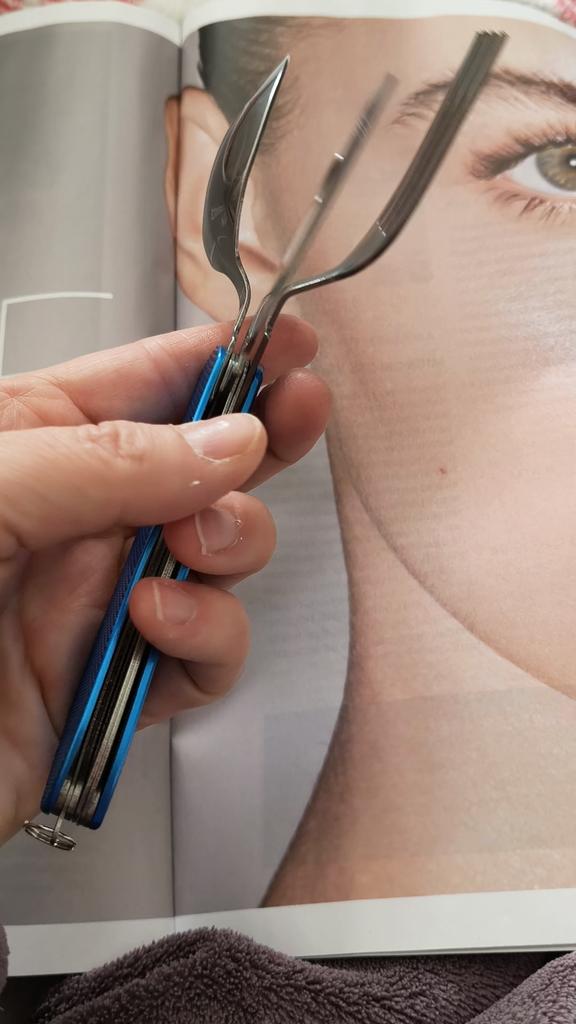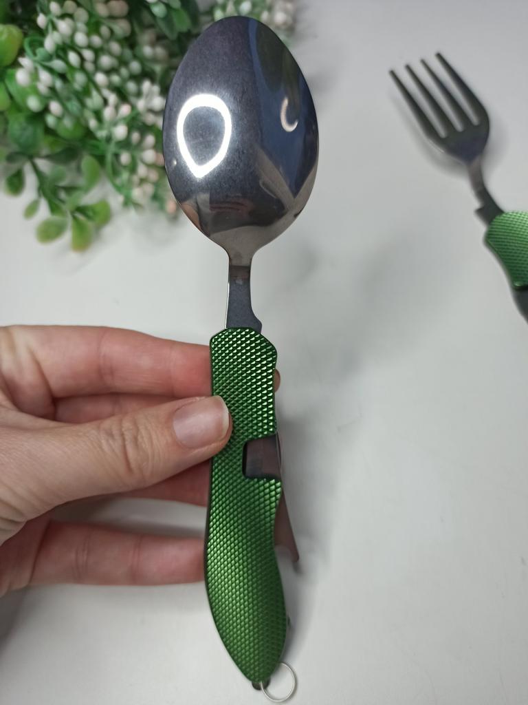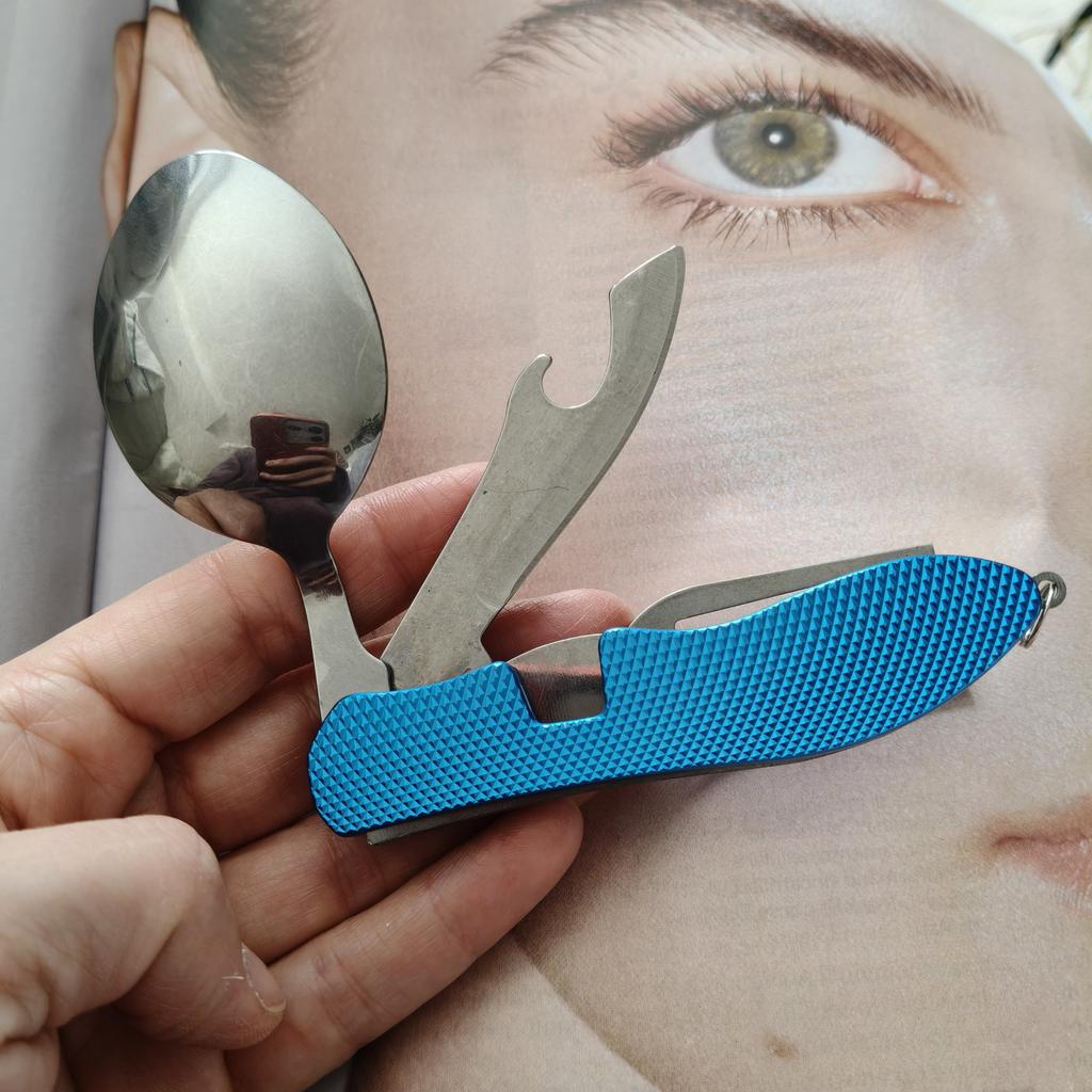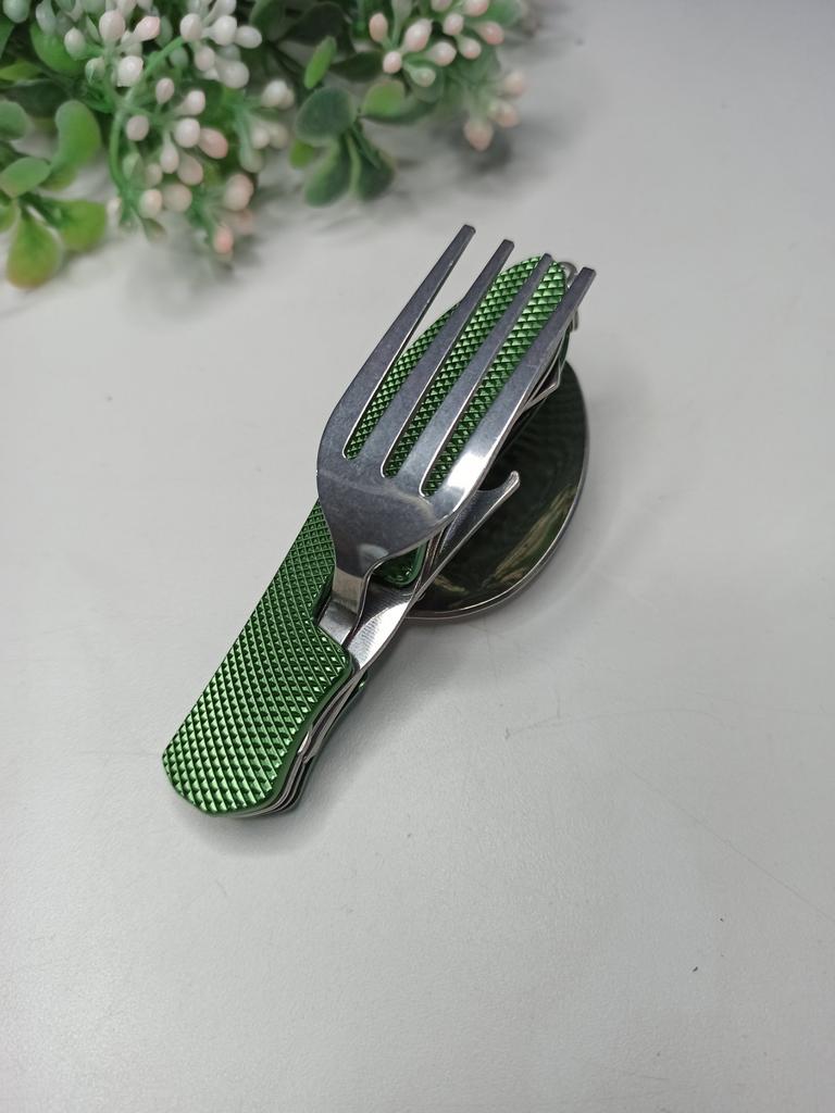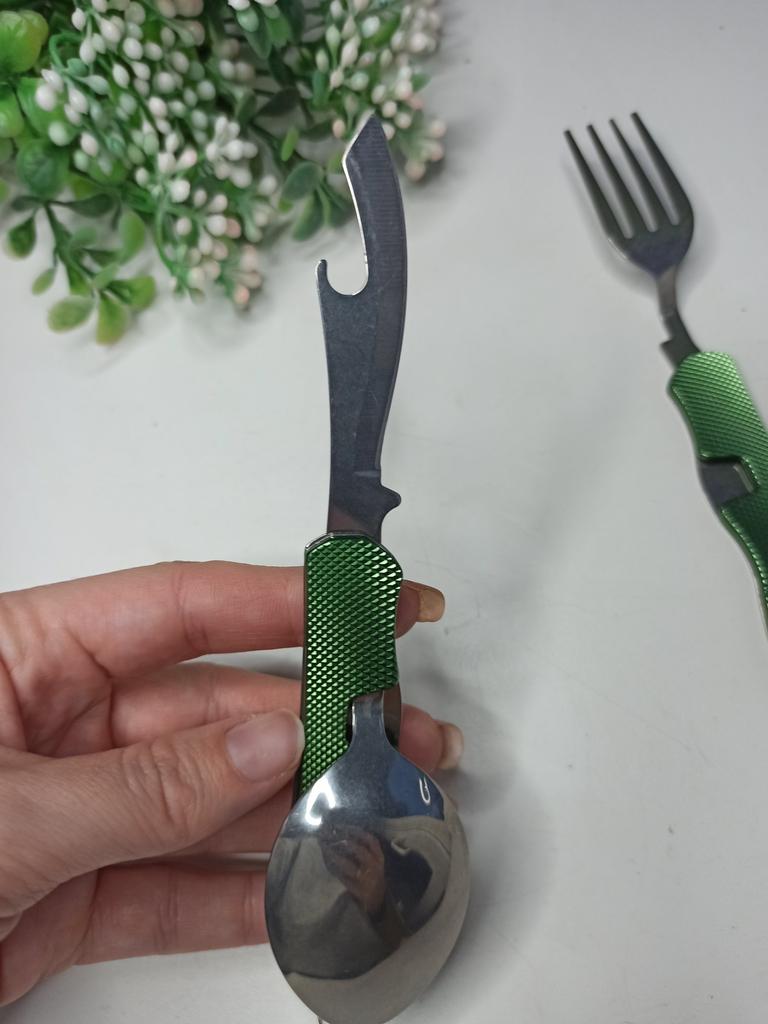 Set turistic de tacâmuri 4 în 1 Include: furculiță, lingură, cuțit și deschizător de sticle. Set multifuncțional, indispensabil într-o multitudine de situații, fie că este vorba de o drumeție, pescuit, vânătoare sau chiar doar un picnic.. Fabricat din oțel inoxidabil, durabil. Mânerul confortabil se așează foarte comod în mână. Setul combină toate tacâmurile deodată. Va fi întotdeauna util. Datorită designului său compact, setul ocupă un spațiu minim când este pliat și poate fi utilizat în cele mai diverse situații.. Multumit de comanda. Vă recomand.