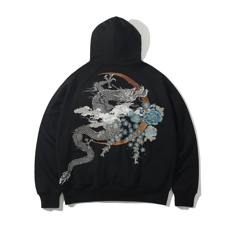 East Rain Men's Hooded Pullover with Dragon Embroidery, Zip-Up Jersey, Long Sleeve, Unique Cotton Sweatshirt, Oversized Outerwear, FUN401