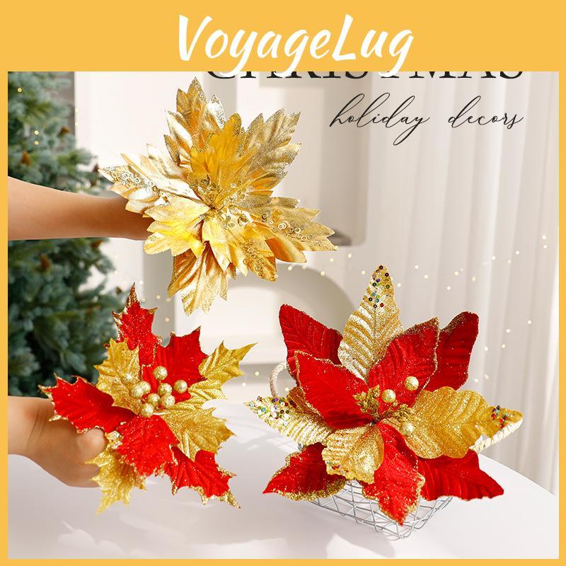 This Christmas decorative flower arrangement features preserved flowers made from durable materials, designed to enhance holiday displays. Available in sizes such as large red and gold with sharp petal accents, it measures approximately 12 inches in height and 8 inches in width. Crafted with attention to detail, it adds elegance to festive settings. Ideal for tabletop decor or wreath embellishments during Christmas celebrations, it maintains its beauty with simple wiping using a damp cloth for easy upkeep.